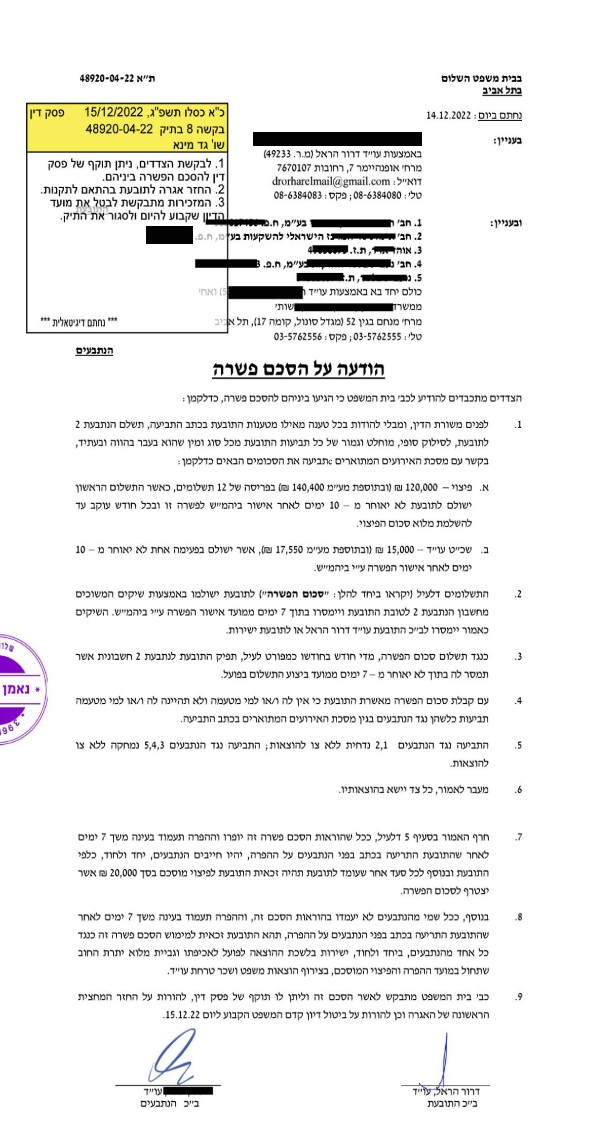 יממה בלבד לפני ישיבת בית המשפט הראשונה וניהול הדיון המקדמי, ב"כ השוכרת פנה למשרדי וביקש לחתום על הסדר לפיו ישולם מלוא סכום התביעה בכדי לסגור את התיק ולייתר את הצורך להתייצב לדיון.
